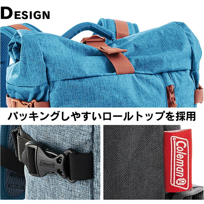 ■Color ・スレイト(2000034338) ・ライトストーン(2000034336) ・ディープオーシャン(2000034335) ・ダークストーン(2000034339) ・ブラックサンド(200003437) ■Spec フロントファスナーポケット(内部にオープンポケット) 両サイドにポケット メイン収納(B4対応、内部にPC収納) ヒップベルト・チェストベルト付き 背面メッシュ仕様 サイドファスナーからメイン収納へのアクセス可能 コールマン リュックの紹介 コールマン リュックサック 33L ロールトップ採用でパッキングへの順応性が魅力のリュックサック。