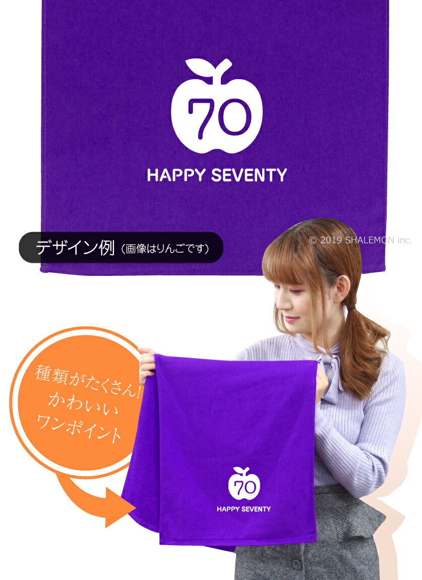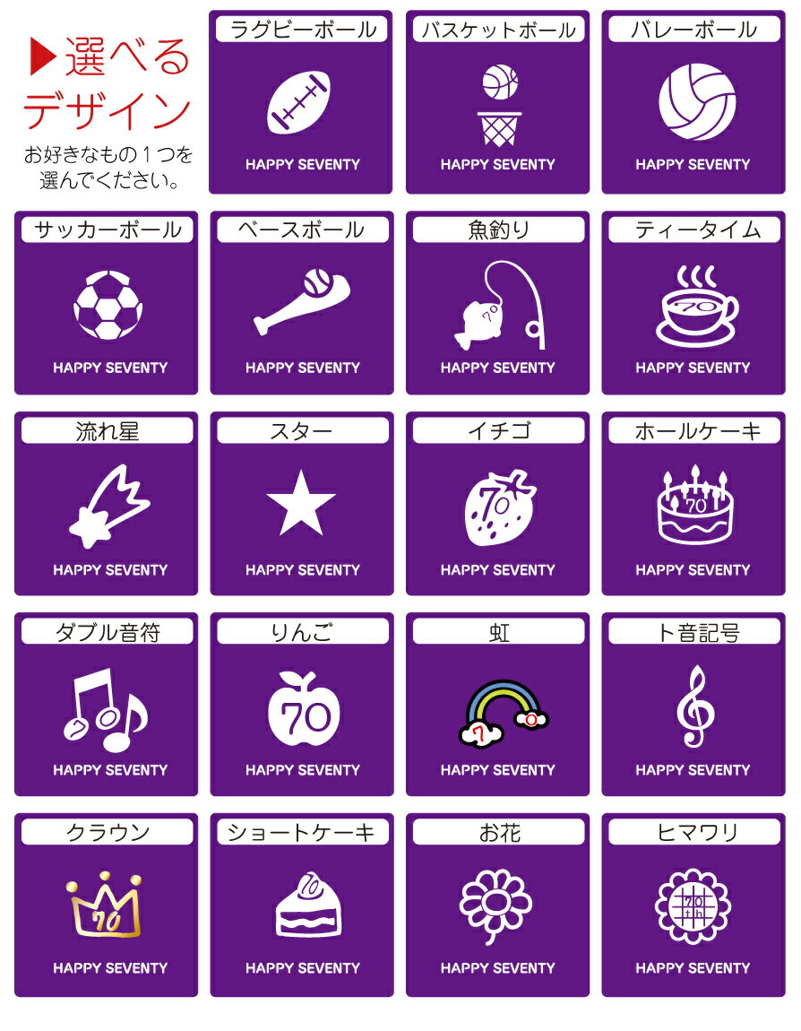 お世話になった人への古希祝いに、ちょっとしたワンポイントデザインのタオルはいかがですか? デザインはなんと全19種から選べます! デザインの下部には HAPPY SEVENTY という文字が入ります。