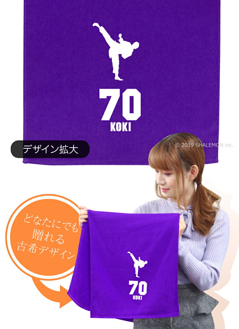 男女ともに使えるデザインの古希祝い用タオルです。