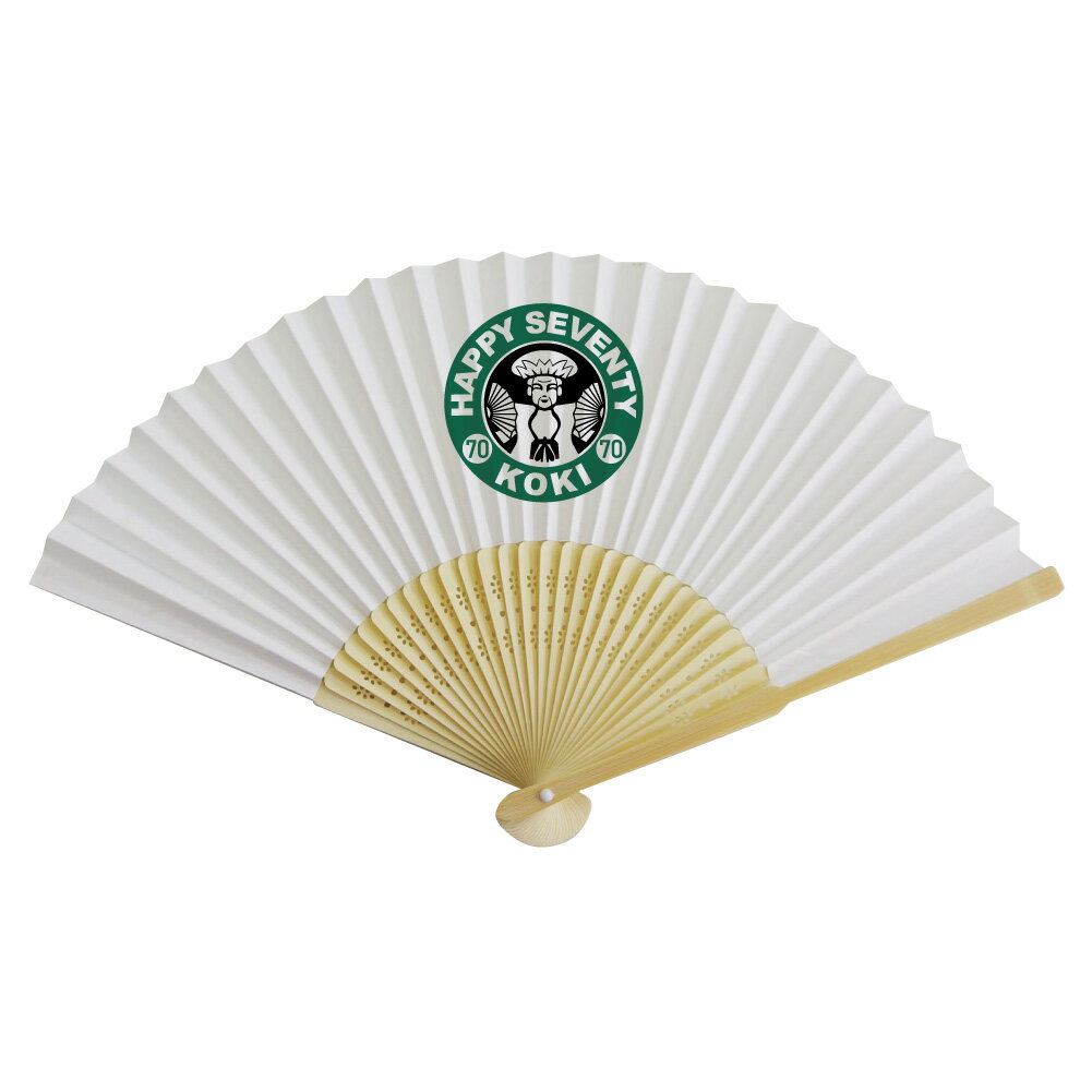 「カフェ風」デザインが最高! シャレもんオリジナル古希祝い用【扇子】 一般的なサイズの和紙と竹で作られた扇子です。