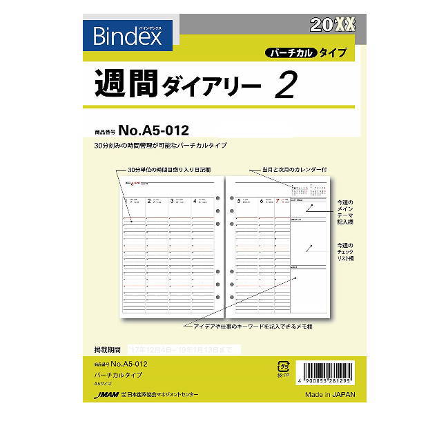 商品名 週間ダイアリー2 バーチカルタイプ A5サイズ リフィル Bindex バインデックス システム手帳 レフィル(日付入 リフィール) 品番 No.A5-012 サイズ 縦210×横148mm (A5サイズ、デスクサイズ 6穴) 仕様 時間目盛り:8:00-20:00 年間カレンダー、年間計画表、月間テーマ、年齢早見表、度量衡換算表、 掲載期間 2018年12月3日〜2020年1月12日 メーカー JMAM (株)日本能率協会マネジメントセンター 30分刻みの時間管理が可能な縦軸バーチカルタイプ。