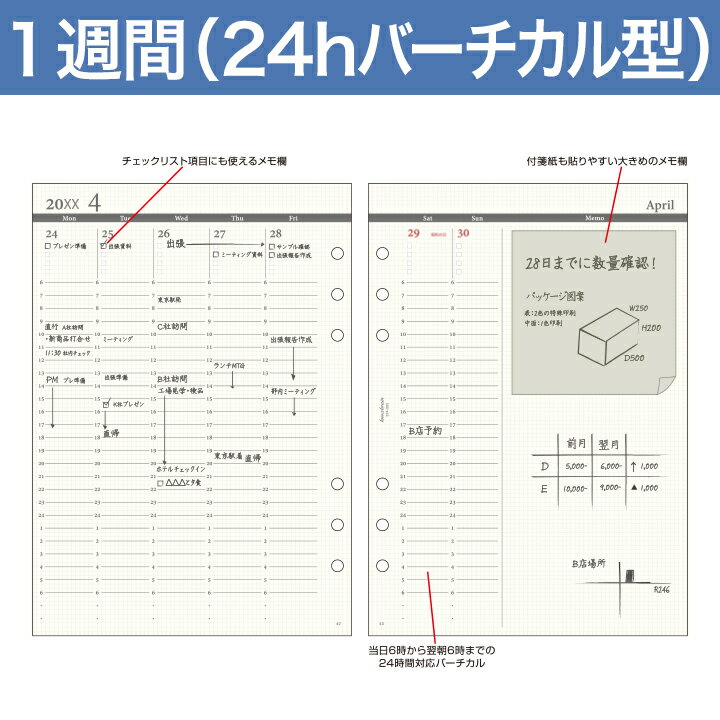 ※サイズ間違いにご注意ください 品番 524-005 サイズ A5(210mm×148mm) 素材 オリジナル手帳用紙(クリーム紙)(2mm方眼入・ 新年度対応 2019年1月〜2020年3月まで) 内容 2019.1〜2020.367枚(見本・付録除) 2019〜2020年間カレンダー2019年六曜一覧表 年齢早見表パーソナルノーツ 備考 旧デザイン品番524-004 / 505-216惜しまれつつ廃番となった24時間バーチカルが復活しました! ●より使いやすく進化 旧版では0時〜24時の表記でしたが、リニューアル版では活動時間をメインに 【朝6時〜24時(夜中)〜翌朝6時】までの24hバーチカル表記になりました。