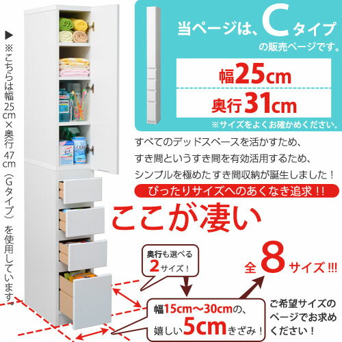 商品名スリム収納 ジャスト Cタイプ 幅25 奥行31 商品仕様【材質】前板:塩ビ化粧繊維版その他:プリント化粧合板 商品サイズ(約)幅25cm×奥行31cm×高さ180cm 商品重量(約)24kg 梱包サイズ(約)幅103cm×奥行33cm×高さ15cm 梱包重量(約)26kg 梱包数1個口 生産国ベトナム 組み立てお客様組み立て品 工具プラスドライバー※工具はお客様でご用意ください。